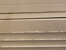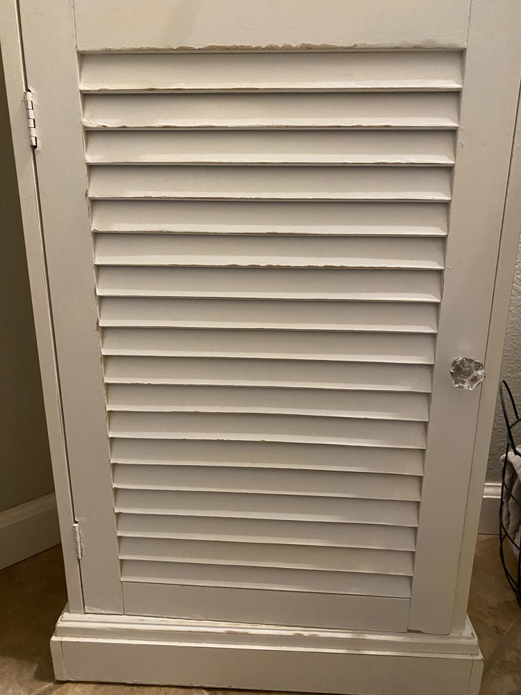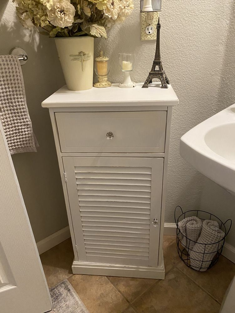 We had a small cabinet from Target in the bathroom that was starting to get some damage from the kids shaking off their wet hands all the time, and also some marks on the top. I gave it a new coat of paint with Rustoleum Chalked in Chiffon Cream. Update: In June 2023, I decided to try to sand down the water damage a little better, and repainted the cabinet flat white. I distressed the cabinet edges so the damage doesn't stand out.