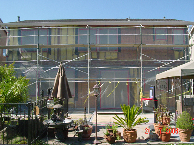 With all of the rain this year, we noticed a leak in one of our windows. After the builders performed further testing, they found some areas where the stucco had created gaps from not properly adhering to the vinyl window frames. Since both the downstairs window and the upstairs bedroom window need to be redone, they decided it would be best to redo the entire wall to avoid this from happening to other windows, and also to keep it from looking "patched".