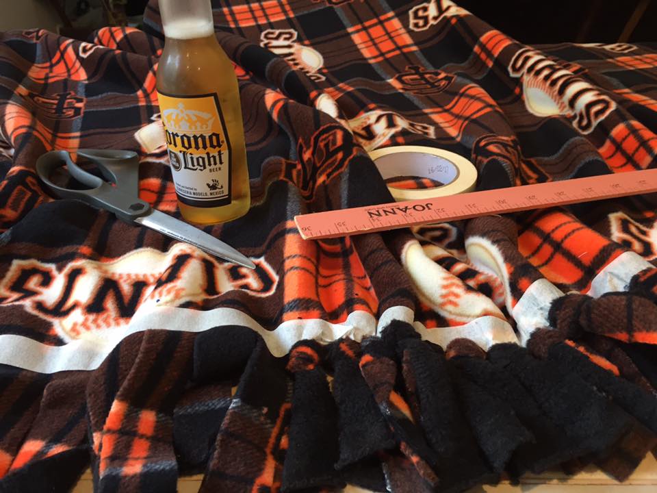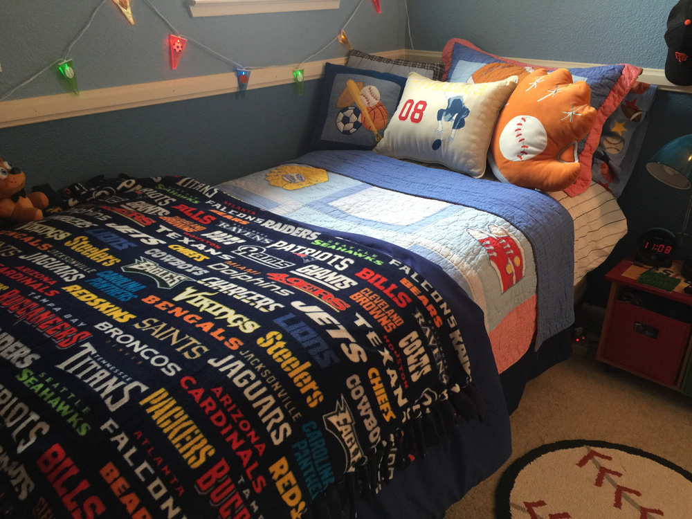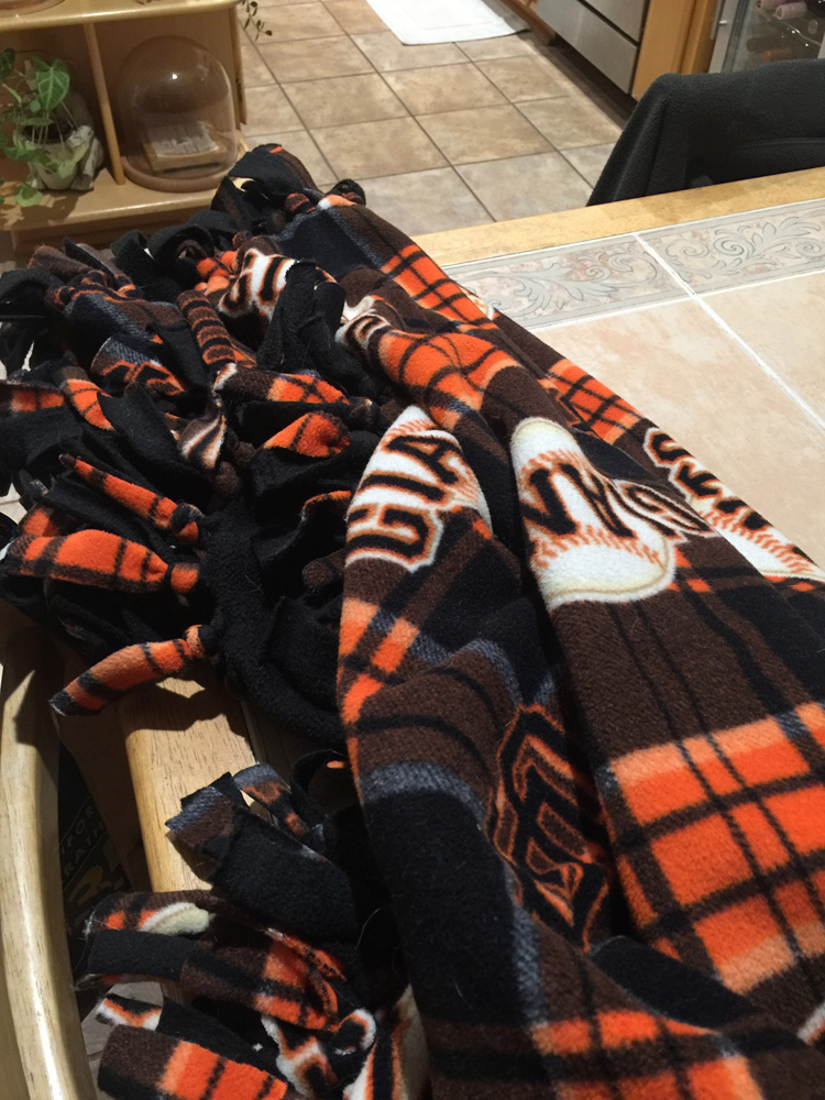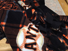 November 24, 2017I made a fleece knotted SF Giants blanket a couple months ago, and I just love it! Ryder wanted me to make one for his bed that matched his room. We were looking for Seattle Seahawks, couldn't find the fabric in our local craft stores. We did find a nice fleece with all the pro football teams -- and it happened to be blue to match his room. There are a ton of links online for how to make these blankets. I've found the best versions show how to tie a "balloon knot". This not comes out looking really nice and less messy than others I've seen. You simply hold the fringes together and tie them just as you would a balloon! I used 2 yards of each fleece for the blankets -- one patterned and one matching solid. It's important to lay them out together and use a yard stick to make sure your edges are all clean and straight and that they match up. The more even they are, the smoother the blanket will be when it's knotted. I've seen some that don't come out with nice square corners, and this is usually why. After the fabric is laid out and matched up, pin a straight line to follow with a yard stick, or use chalk to mark. I used masking tape on the first one to be sure my cuts ended evenly. The blog post I read said to do 5-inch cuts, but I had a hard time making the knots so I ended up making them 6 inches. After you decide on the cut length, cut that size square out of each corner -- for instance, I cut 6x6" squares out of each corner. Keep laying down your yard stick to make sure you are cutting a straight line to where your pins are. Make sure you hold the fleece together well so they match up. The balloon knots are very easy to tie. B sure to pull them very tightly. As you go, you can stretch the fabric out to make sure your knots are lying flat. I make my blankets while watching TV and I was surprised at how easy they were. They both came out great and we love them. I am looking forward to brining mine to baseball games all season! Click any image for larger view. << Back to Projects Page: 1 2 |