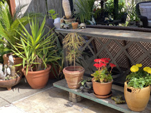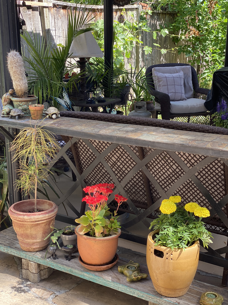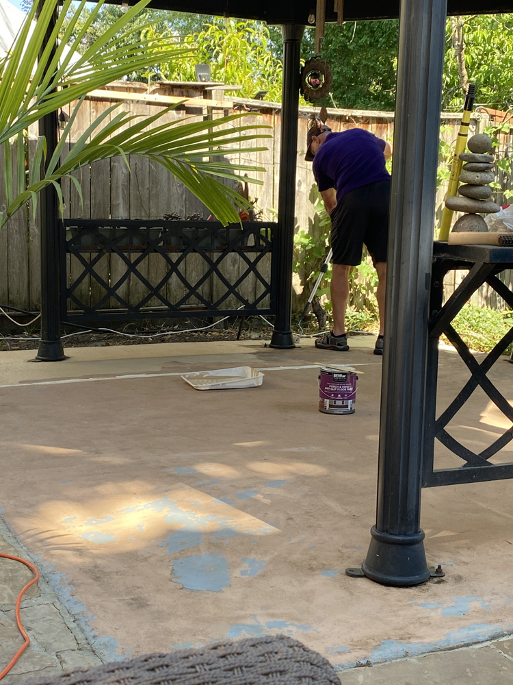 We used to have a hot tub where the slab was in the gazebo so we painted over the original coating with some anti-slip paint that was peeling. Since we are fixing up the yard for Hunter's 21st birthday party, we decided to take everything out and repaint the slab with the same anti-slip paint, but this color is a better match to the flagstone and the house.