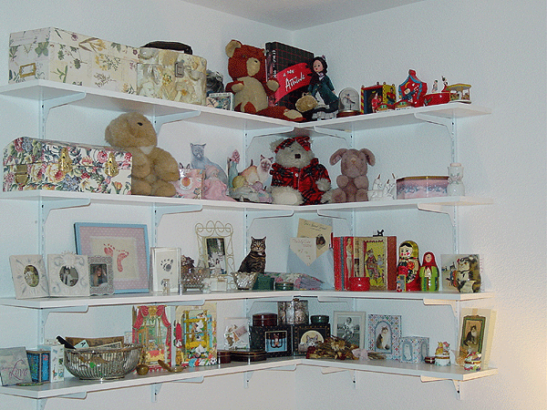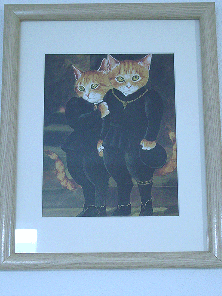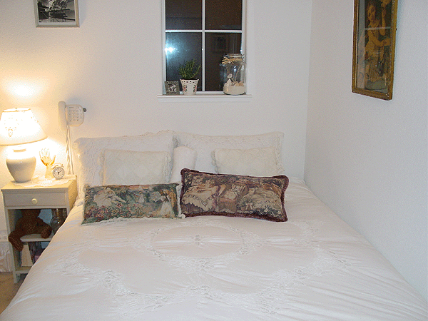 Victorian-style bedding. Cute accessories... Shelves Dave put up for me. New curtain. Picture I framed from a calendar. Another framed calendar picture. Lots of cat-inspired touches...this is Allie's room! This old painting by Heidi's mom fits perfectly in our new guest room!