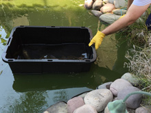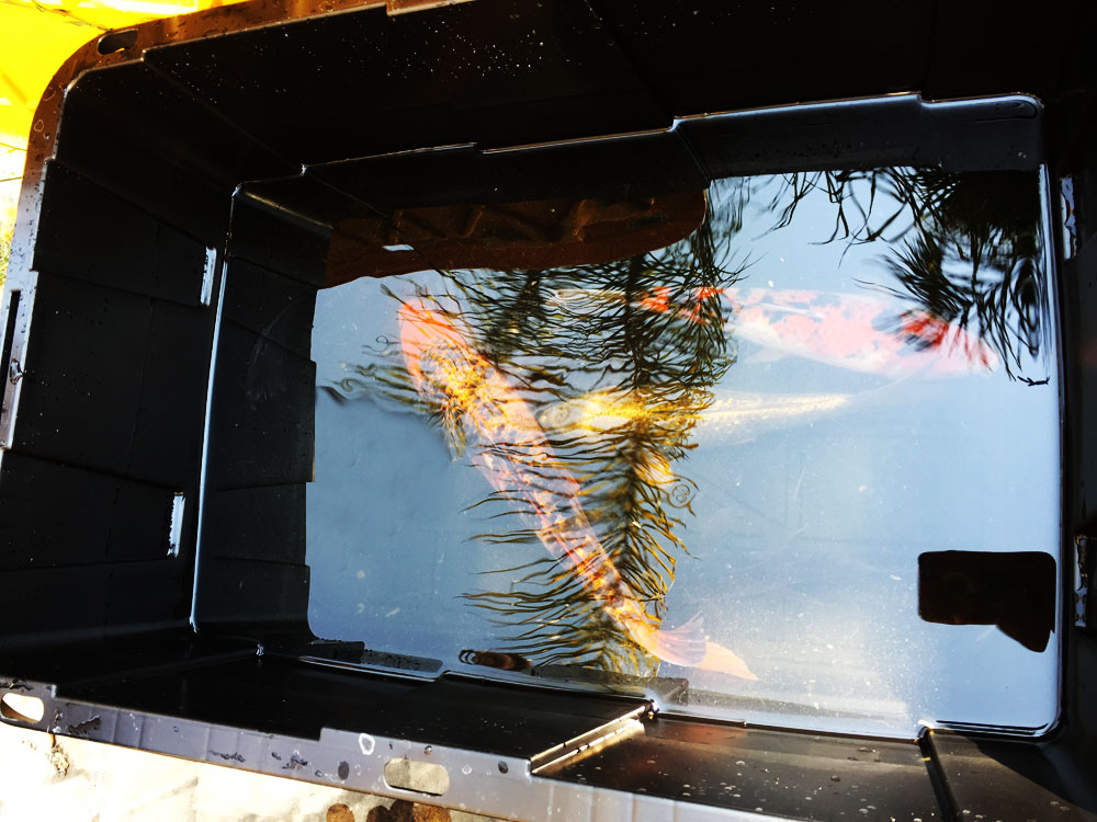 My mom has decided it's too much trouble to try to fight off the raccoons and birds looking for a meal in her pond. She removed the remaining koi and will drain it. Fortunately, we have room in our pond to give them a new home! The biggest, Hellboy, is having a wonderful time with all the new space!