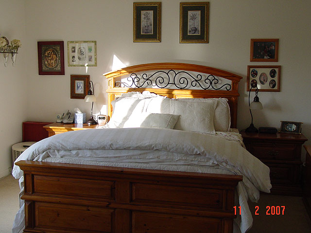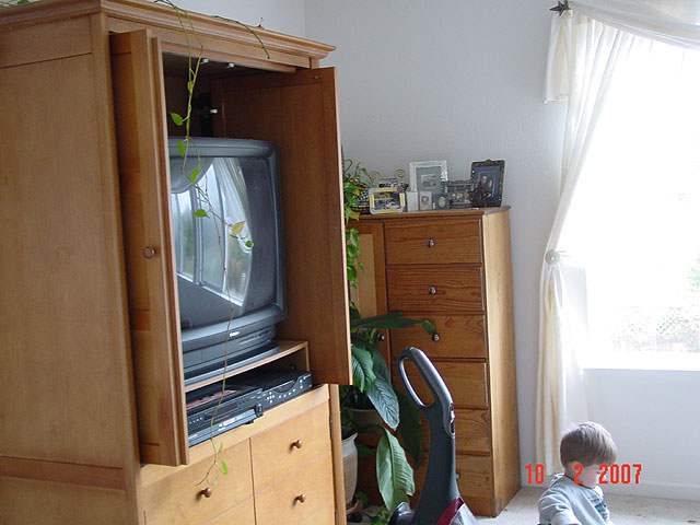 Our master bedroom was way too crowded with furniture and we had a lot of plants in high places that were too hard to water. We moved everything in the room to to dust and vacuum, took out two large pieces of furniture, and a lot of plants. We also moved the existing furniture around and mounted the dresser mirror on the wall. We have replaced the TV with a 42" plasma, and will also be adding in-wall speakers.