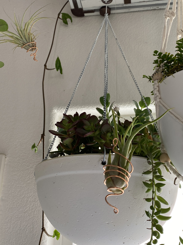 I saw a picture of a cute plant hanger that looked like an old ladder and wanted to make something like it. It was my mom's idea to refinish the pot rat we took down and use that insstead. I absolutely love it and my plants couldn't be happier!
