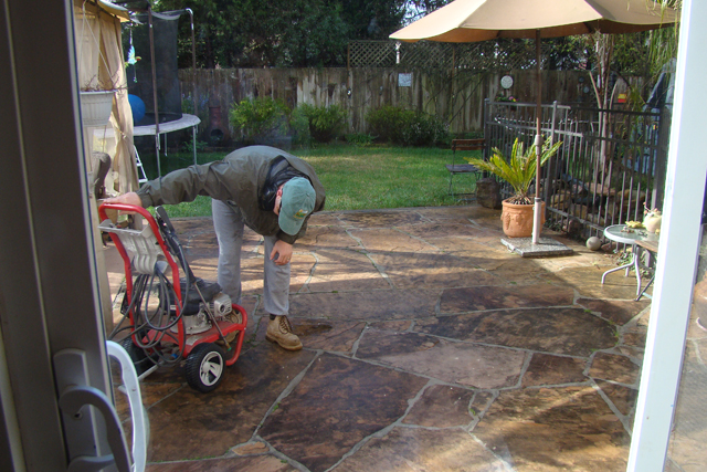 Very dirty flagstone before. Dave pressure washing. Dave pressure washing. Dave pressure washing. After pressure washing. After pressure washing. After 30-second cleaner. Looking much better.