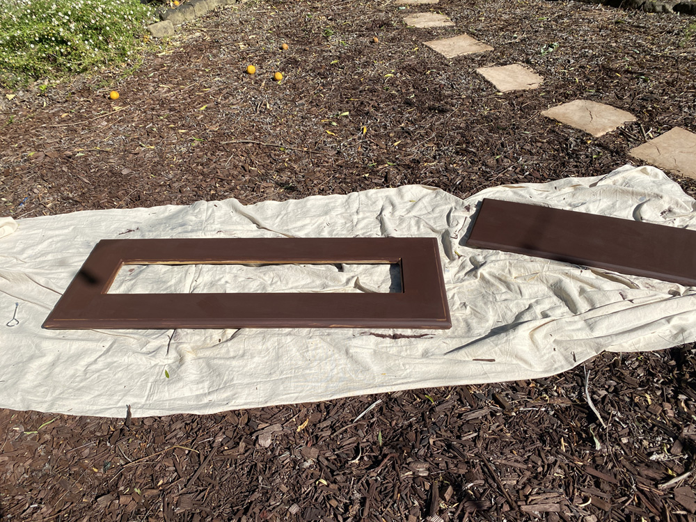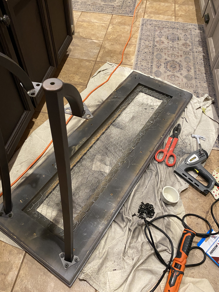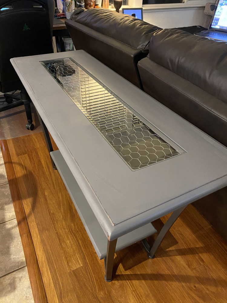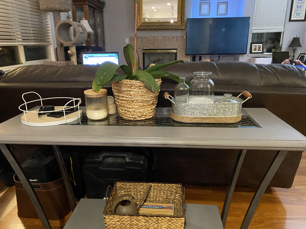 I wanted a new sofa table, but couldn't find anything I liked. I decided to try to refinish the table we had and used some chicken wire to give it a farmhouse look. As I've done with other pieces I've refinished, I first painted the table dark brown with old spray paint, then painted it a light gray chalk paint. I used sandpaper to distress it, and stapled chicken wire under the glass insert so it looked more rustic.