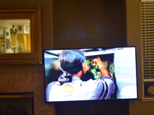 We had a media nook built into the living room, so we were limited on TV size. We have had two projection TVs in this spot, but finally decided to figure out a way to mount a flat screen. We purchased a 65" Samsung smart TV. Dave got a board with a nice wood finish, so we wouldn't have to paint it. (It really won't show anyway) We hung the board in the nook, and installed a full-motion wall mount for the TV.