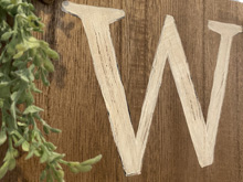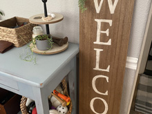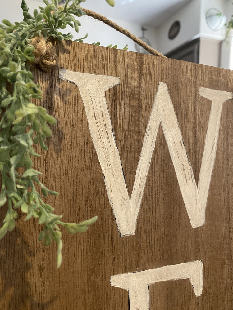 Found this sign in the dollar section at Target for $5. I have been wanting a cute welcome sign to put out front. I traced the letters with a small amount of paint on an atist brush so I would have the general lines done. Once I had a clean outline, I carefully used craft paint to fill in the letters. After it was all dry, I used a fine sandpaper to scuff them a bit. I then used a walnut stain to make the whole thing darker. I went over the painted letters as well to take the brightness away and age it a little.
