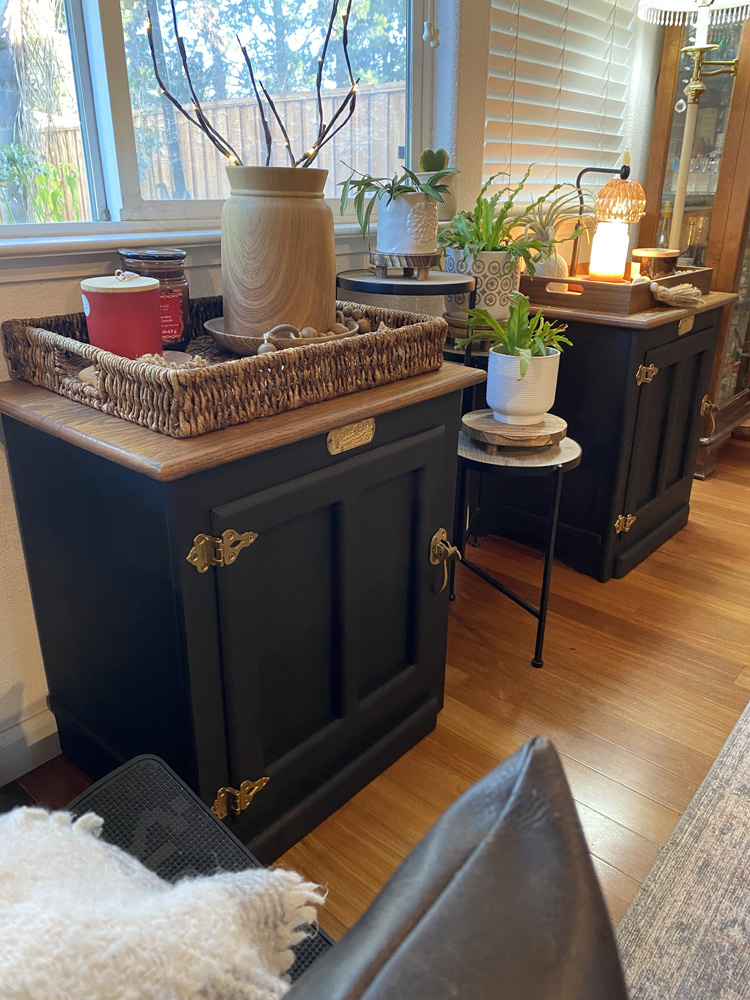 September 1, 2024Last fall I found these two White Clad end tables at a thrift shop on sale for $12 each! Since the weather wasn't great for painting, I put them in the house as is until I had time to work on them. Finally, I have had some free time to refinish them and I absolutely love them! These sell for hundreds refinished on Etsy, and this only cost me a quart of paint! I already had the stain so I darkened the oak top and polished up the brass, and I think they are stunning in black. Afterwards, we relaxed with some margaritas! Click any image for larger view. |
